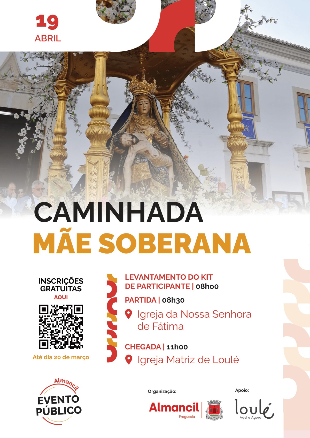 Ver na agendaNo dia 19 de abril, a manhã será dedicada à prática desportiva e à valorização do património do nosso concelho, ligando Almancil a Loulé.O levantamento do kit de participante será feito às 08h00, em frente à Igreja de Nossa Senhora de Fátima, em Almancil. O início da caminhada está previsto para as 08h30, contando chegar à Igreja Matriz de Loulé pelas 11h00.Já fez a sua inscrição? O formulário de inscrição está disponível até dia 30 de março no seguinte link:https://forms.gle/txybE8AEK2ajoP1X8
