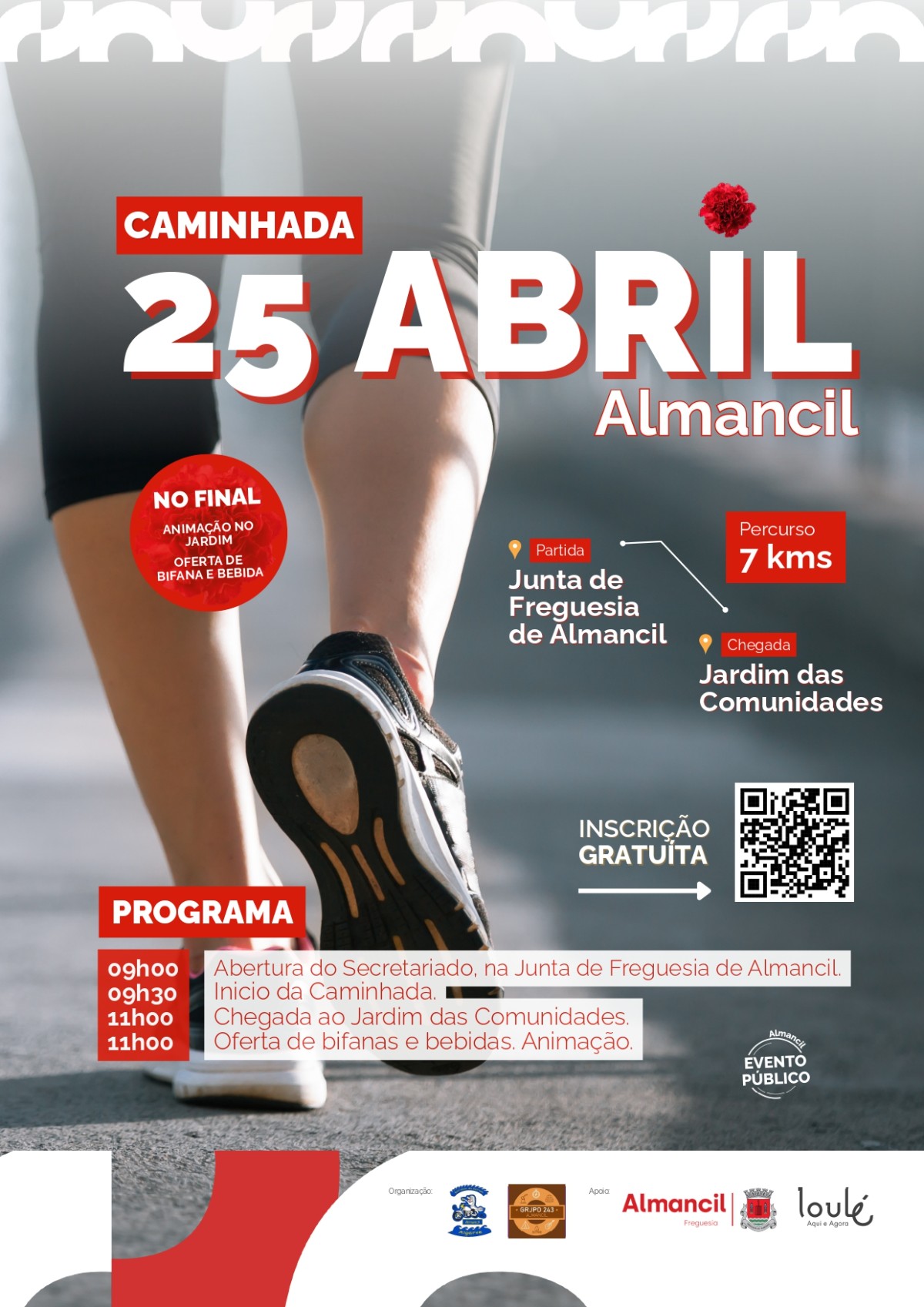 No próximo dia 25 de abril, a cidade de Almancil assinala o Dia da Liberdade com uma atividade aberta a toda a população.A Caminhada do 25 de Abril terá uma extensão de cerca de 7 quilómetros, com início marcado junto à sede da Junta de Freguesia e chegada no Jardim das Comunidade.Para garantir que a celebração termina da melhor forma, a organização preparou um momento de animação no final do trajeto, onde será oferecida uma bifana e uma bebida a todos os participantes para reporem as energias.Embora a participação seja totalmente gratuita, a inscrição é obrigatória e deve ser realizada até ao dia 22 de abril através do link https://forms.gle/GYgcbTKKmMZUyfpx7Este evento resulta de uma organização conjunta entre o Grupo Motard Golfinhos da Estrada e o Grupo 243 de Almancil da Associação de Escoteiros de Portugal, contando com o apoio da Junta de Freguesia de Almancil.Prepare o calçado confortável e venha celebrar esta data histórica connosco!